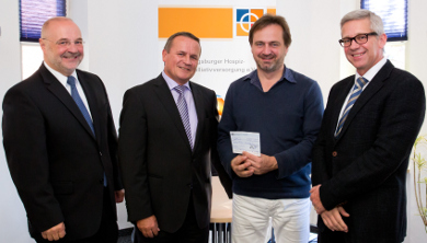 (Augsburg) Am 3. November übergab Thomas Schütz, Sachgebietsleiter Soziales und Jugend bei der Regierung von Schwaben, in Vertretung von Regierungspräsident Karl Michael Scheufele im Pferseer Schlössle 5.000 Euro an Dr. Dr. Eckhard Eichner, den Vorstandsvorsitzenden der Augsburger Hospiz- und Palliativstiftung. Wichtigste Gäste waren Ulrich Kain, Vorstand der VR-Bank Handels- und Gewerbebank, und Peter Ferner, Regionaldirektor Schwaben des Genossenschaftsverbands Bayern. Denn die Spende kommt vom Gewinnsparverein der Raiffeisen- und Volksbanken in Bayern e.V. Die Stiftung will mit den 5.000 Euro den Aufbau der Hospiz- und Palliativversorgung im nördlichen Landkreis Augsburg und Fortbildungen voranbringen.
